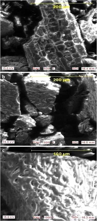 掃描電子顯微鏡通過用聚焦的電子束掃描來產(chǎn)生樣品的圖像。甲酸和乙酸吸附前后制備的活性炭的SEM圖如圖2所示 。 圖2a顯示吸附前活性炭的形態(tài)。碳表明活性炭的表面性質(zhì)是高度多孔的,并且會增強甲酸和乙酸的吸附。碳呈現(xiàn)不規(guī)則的網(wǎng)狀結(jié)構(gòu),這意味著由粗糙表面積組成的完整的三維多孔內(nèi)部結(jié)構(gòu)的形成。熱解過程中焦炭的孔隙發(fā)育也很重要,因為這將通過促進活化劑(HNO 3)分子擴散到孔中從而增加活性炭的表面積和孔體積,從而增加HNO 3碳相互作用,在活性炭表面產(chǎn)生更多的孔。活性炭表面上這些孔的發(fā)育可能是導(dǎo)致水溶液中乙酸和加速那吸收量高的主要因素。很明顯在圖2 B,C的吸附前活性炭的表面上的大的孔碳的表面上吸附的吸附后均減少。這意味著甲酸和乙酸被吸附到制備的活性炭的表面上。