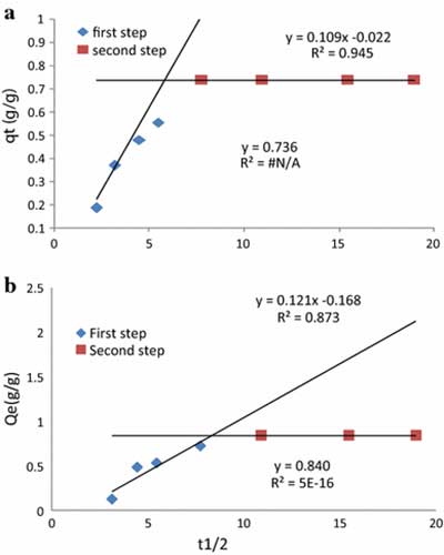 吸附機理粒子內(nèi)擴散模型用于確定總體吸附速率是否通過顆粒內(nèi)擴散來控制,即吸附物質(zhì)分子進入活性炭孔隙內(nèi)部。q t對t 1/2的曲線圖給出如圖3所示的線性關(guān)系 。截面(C)的值和斜率的粒子內(nèi)擴散速率常數(shù)(Kid)的計算值總結(jié)在表中。較大的截距值表明,與表面擴散相比,顆粒內(nèi)擴散具有較小的作用。該圖顯示在吸附過程中發(fā)生兩個步驟。急劇上升的部分是外表面吸附階段,而第二直線部分是逐漸吸附階段,其中顆粒內(nèi)或孔擴散是速率限制。急劇上升部分的高R 2值表明外表面吸附是速率限制步驟。線偏離原點和低R 2逐漸吸附階段的值表明,顆粒內(nèi)擴散不是唯一的限速步驟,因為早期報道了類似的結(jié)果。這意味著外表面的吸附或瞬時吸附階段發(fā)生,并且可以被用來描述吸附過程的機構(gòu)。