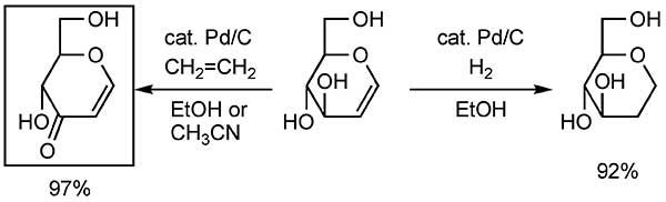 醇氧化為羰基化合物是有機合成中最基本的反應之一。我們實驗了的Pd / C -乙烯系統為芐基和烯丙基醇氧化成相應的酮。該反應的代表性實例示于圖1中。在氫氣氛下用催化量的Pd / C在乙醇中處理D-葡糖糖得到92%收率的“正常的”氫化2-脫氧-1,5-脫水葡萄糖醇。相反,當在乙烯氣氛下進行相同的反應時,得到脫氫的1,5-脫水己-1-烯-3-酮,產率為97%。