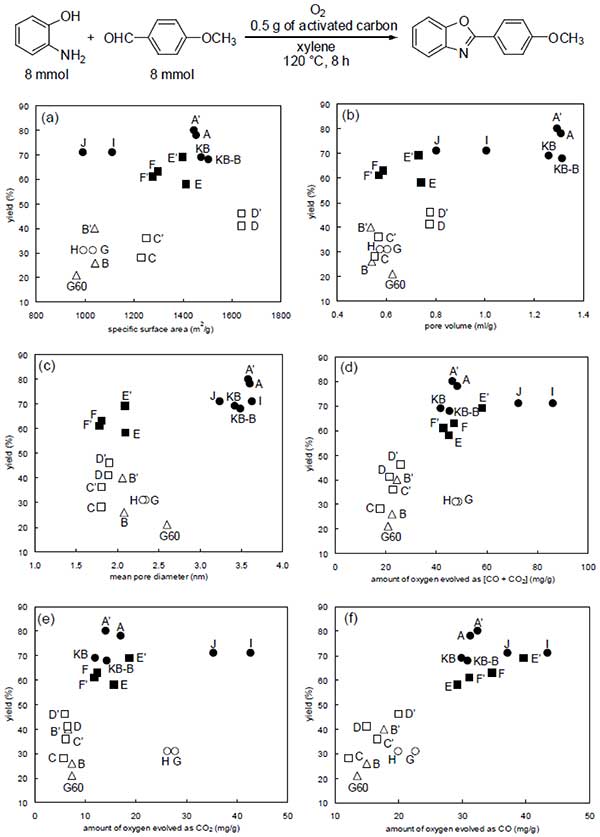 圖2.活性炭性質對反應收率的影響。(a)比表面積,(b)孔體積,(c)平均孔徑,(d)作為[CO + CO 2 ]放出的氧量,(e)作為CO放出的氧量,以及(f)氧的演變為CO 2。●化學活化(木質),●化學活化(椰殼),○蒸汽活化(木質),□蒸汽活化(椰殼),△蒸汽活化(煤質)。