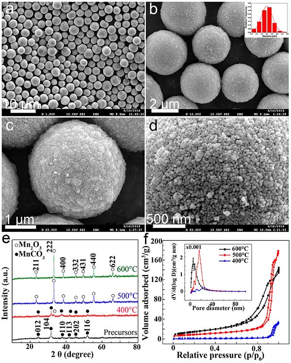 基于逐步自組裝生長的方法,可以首先在甘油中制備具有良好控制的尺寸和形態的單分散的MnCO 3前體微球體,然后將其轉化為分級的多孔Mn 2 O 3通過在400,500和600℃下退火8小時,大規模涂覆活性炭的微球體。我們可以通過簡單地使用甘油作為溶劑合成活性炭層來裝飾Mn基電極材料,然后在較高溫度下原位碳化生物質。根據一系列的實驗測試發現這些材料的高度增強的電化學性能可歸因于它們的表面的活性炭涂層。