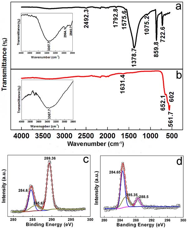 圖2. (a)前體和(b)活性炭氧化錳提的FTIR光譜。(c)前體和(d)活性炭氧化錳提的X射線光電子能譜(XPS)C1s譜。(a,b)中的插圖分別突出了來自2800-4000cm -1的前體和最終產物的FTIR光譜,其中縱軸放大。