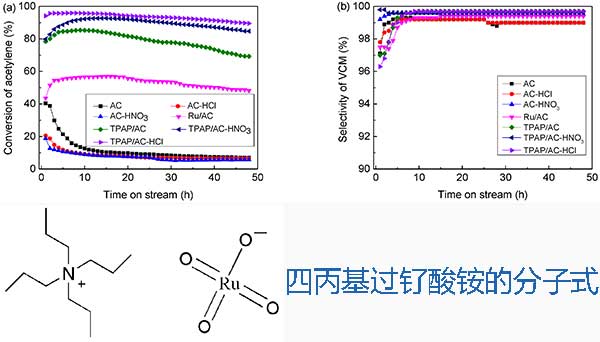 雖然乙炔的加成反應與氯化氫是氯乙烯單體(VCM)的直接合成的重要途徑,在傳統的工業用過的催化劑是活性炭載的HgCl2,其擁有一個嚴重的環境污染和人員危險其高毒性和易燃性。再加上汞資源短缺,非汞催化劑的研究一直是重點。發現納米結構載體,如Al2O3 ,金屬有機骨架(MOFs)衍生的固體堿,介孔二氧化硅納米顆粒[MSN] ,金屬氧化物載體(MO x)等。通常用于催化反應。但由于其物理化學性質不同,其中有些不利于乙炔氫氯化的有效支持。受益于表面上發達的孔結構和相互作用,活性炭成為乙炔氫氯化反應的理想材料,載體表面的官能團可以影響活性炭的性質。高價釕是乙炔氫氯化Ru催化劑的關鍵活性組分。通常通過改變RuCl 3獲得高價釕物種或載體,關于釕配合物催化劑與高價釕催化劑在乙炔氫氯化反應中的應用相關的文獻很少。因此,本文采用一定濃度的鹽酸或硝酸處理交流負載四丙基過釕酸銨(TPAP)制備了Ru基活性炭催化劑,并對乙炔氫氯化反應的催化性能進行了評價,希望找到一種容易制備,更高活性,更穩定和經濟的無汞催化劑。