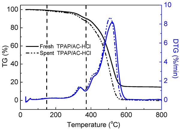如圖2所示,通過TGA研究了廢催化劑的焦炭沉積。以TPAP/活性炭-HCl為例,不僅新鮮的TPAP/活性炭-HCl催化劑在150℃以前因在催化劑表面發生水解或小分子解吸而出現輕微的質量損失。在150-385℃的范圍內,新鮮催化劑和廢催化劑均有緩慢的質量損失。然而,當溫度超過385℃時,由于載體的燃燒,催化劑質量損失快。考慮到這一點的活性炭本身會失去它的重量在空氣氣氛中,以產生CO 2,在150-385℃的范圍內的質量損失反映了花費TPAP/活性炭-鹽酸催化劑上的焦炭沉積量。