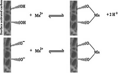 制備的活性炭表面含有氧和芳族化合物的官能團。這些團體可以參與化學鍵合,負責活性炭的陽離子交換能力。因此,活性炭/錳反應可以用兩種方式表示(圖2)。根據此圖,離子交換的可能機制可以被認為是一個錳離子(Mn2 +),其自身附著在兩個相鄰的羥基和雙氧基上,可以將兩對電子給予金屬離子,形成四個配位數化合物并將兩個氫離子釋放到溶液中。