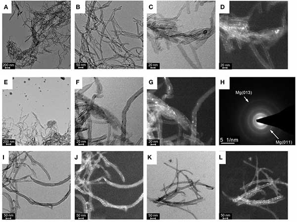 圖1。(A,B)活性炭的透射電子顯微鏡(TEM)圖像的明視野,(C)在活性炭上沉積的鎂的明場和(D)暗場TEM圖像,濃度為1mg毫升-1,(E,F)明場和(G)的鎂的暗場TEM圖像保藏在碳納米管為2毫克ml的濃度-1,(H)中的分散體的相關聯的所選區域電子衍射(SAED)圖案活性炭(I)明場和(J)的Mg的暗場TEM圖像保存在活性炭為5毫克ml的濃度-1 (K)明場和(L)的Mg的暗場TEM圖像保存在活性炭為10mg ml的濃度-1。