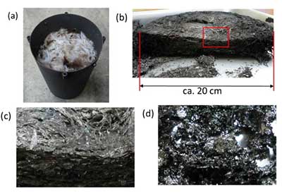 圖1。在800 ℃ 熱處理后得到的原料和方法:a)在不銹鋼反應(yīng)器中引發(fā)羽毛,b)由羽毛和酚醛樹(shù)脂以1:1的質(zhì)量比(F1Ph1) c)羽毛活性炭。