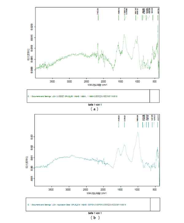 圖1. (a )來自棉籽皮的活性炭的FTIR光譜; (b )來自棉花的活性炭的FTIR光譜。