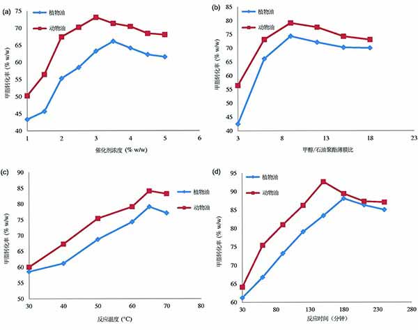 圖3.(a)催化劑量,(b)甲醇與油的摩爾比,(c)反應溫度和(d)反應時間對甲酯產率的影響。