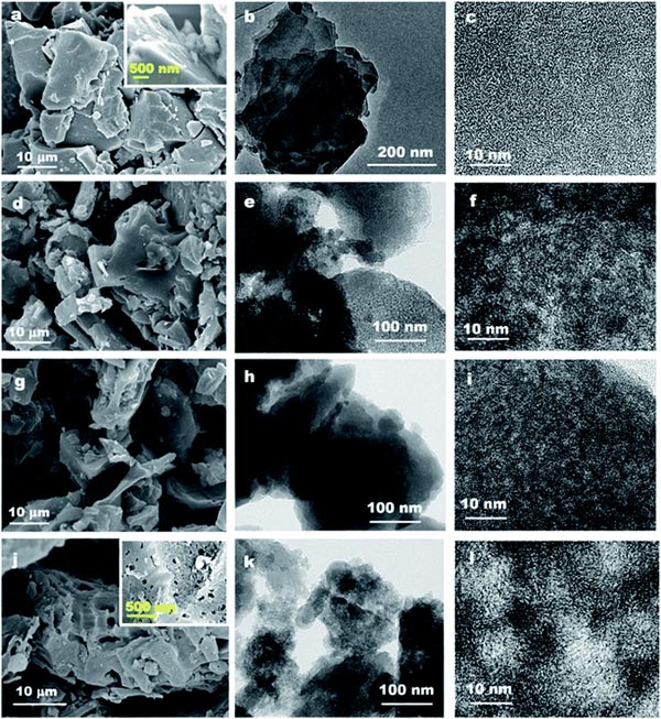 圖1、原煤的SEM和TEM圖像以及通過各種活化程序得到的衍生活性炭。原煤的SEM(a),TEM(b)和HRTEM(c)圖像,SEM(d),TEM(e)和HRTEM(f)活性炭圖像,SEM(g),TEM(h)和HRTEM(i)化學(xué)活性炭的圖像;SEM(j),TEM(k)和HRTEM(1)物理活性炭圖像。