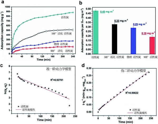 圖2、吸附動(dòng)力學(xué)結(jié)果。(a)吸附能力隨時(shí)間的變化;(b)典型樣品的BET表面積的標(biāo)準(zhǔn)化吸附容量;(c)活性炭的偽一階動(dòng)力學(xué)擬合;(d)活性炭的偽二階動(dòng)力學(xué)擬合。